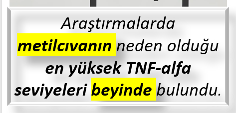 Metilcıva çeşitli dokularda birikebilir ancak araştırmalarda, metilcıvanın neden olduğu en yüksek TNF-alfa seviyeleri beyinde bulundu. Bu TNF-alfa yolu ile cıvanın beyin nöronlarına zarar verdiğini kanıtlar.
