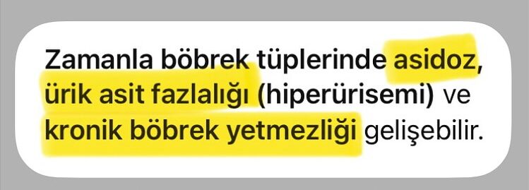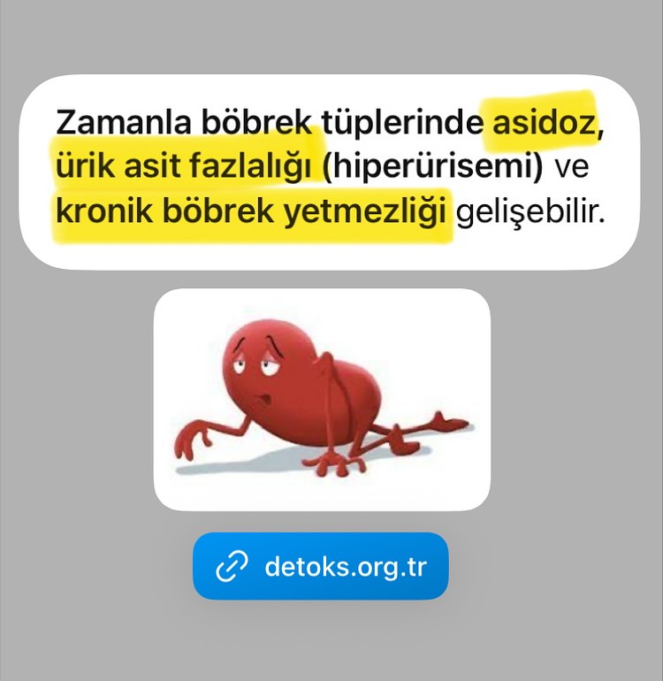 Zamanla böbrek tüplerinde asidoz, ürik asit fazlalığı (hiperürisemi) ve kronik böbrek yetmezliği gelişebilir.