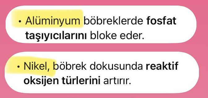 | Alüminyum (Al) | Fosfat taşıyıcı blokajı, Fe-Mg bozukluğu | Mg, Zn, Se | Hipofosfatemi, fibrozis |