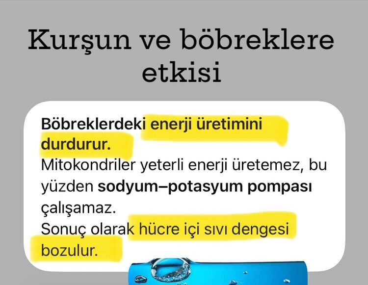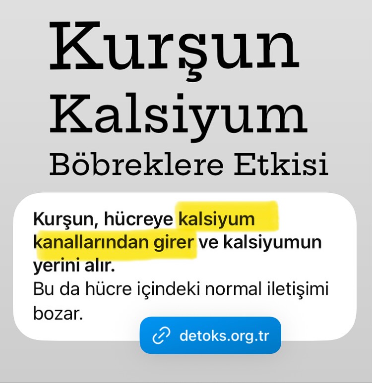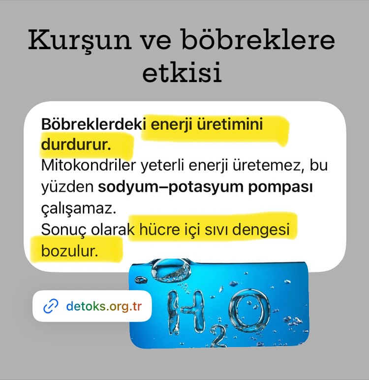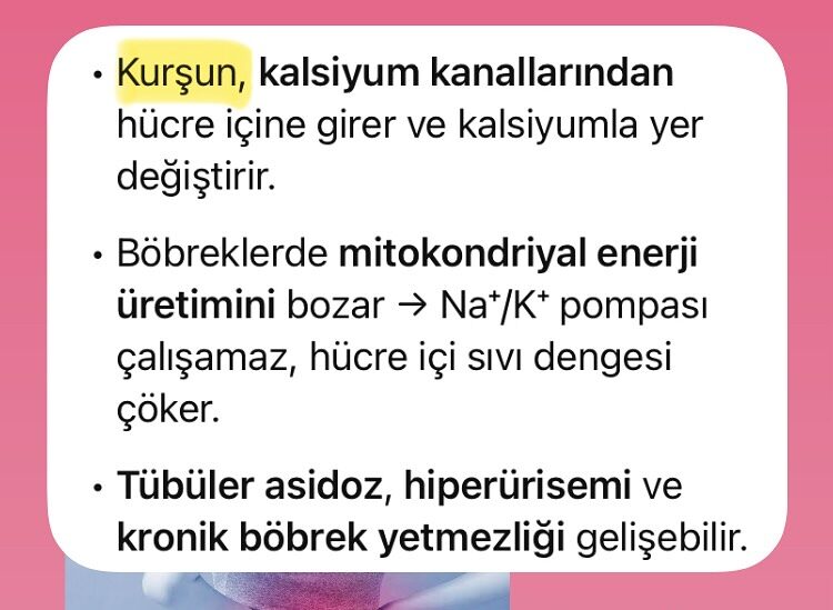 | Kurşun (Pb) | Ca yerine geçer, mitokondriyi bozar | Ca, Mg, Fe, Zn | Asidoz, kronik yetmezlik |