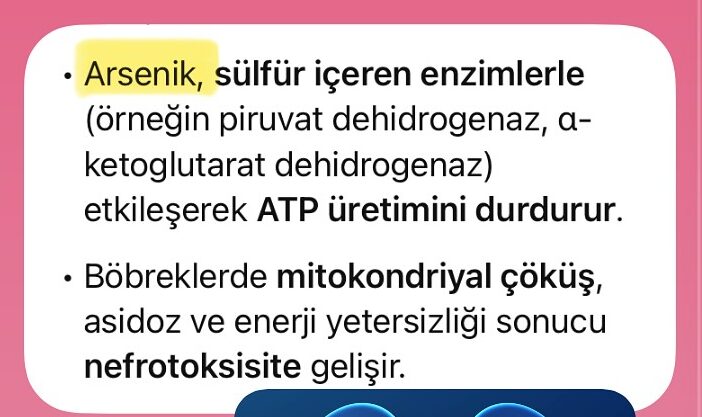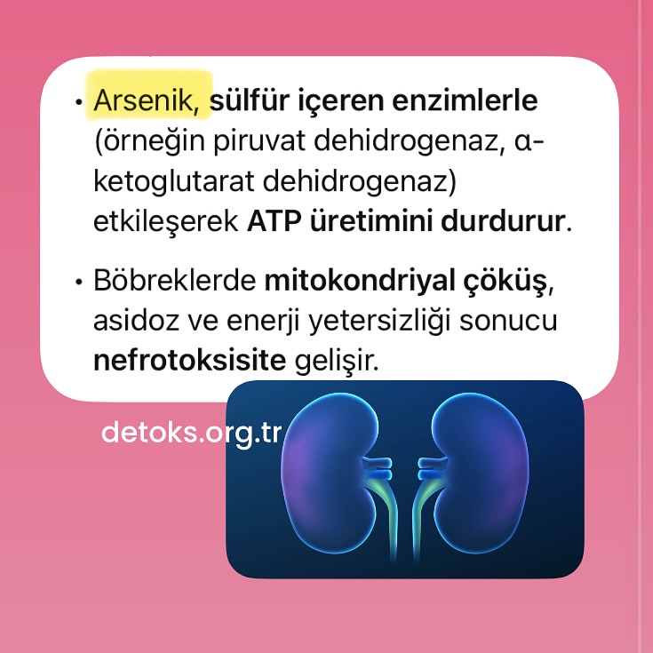Arsenik, sülfür içeren enzimlerle (örneğin piruvat dehidrogenaz, α-ketoglutarat dehidrogenaz) etkileşerek ATP üretimini durdurur.