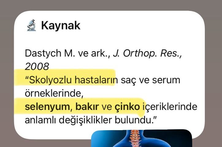 Araştırmalar, skolyoz hastalarının saç ve serum örneklerinde: Çinko, bakır ve selenyum gibi elementlerde anlamlı değişiklikler olduğunu gösteriyor.